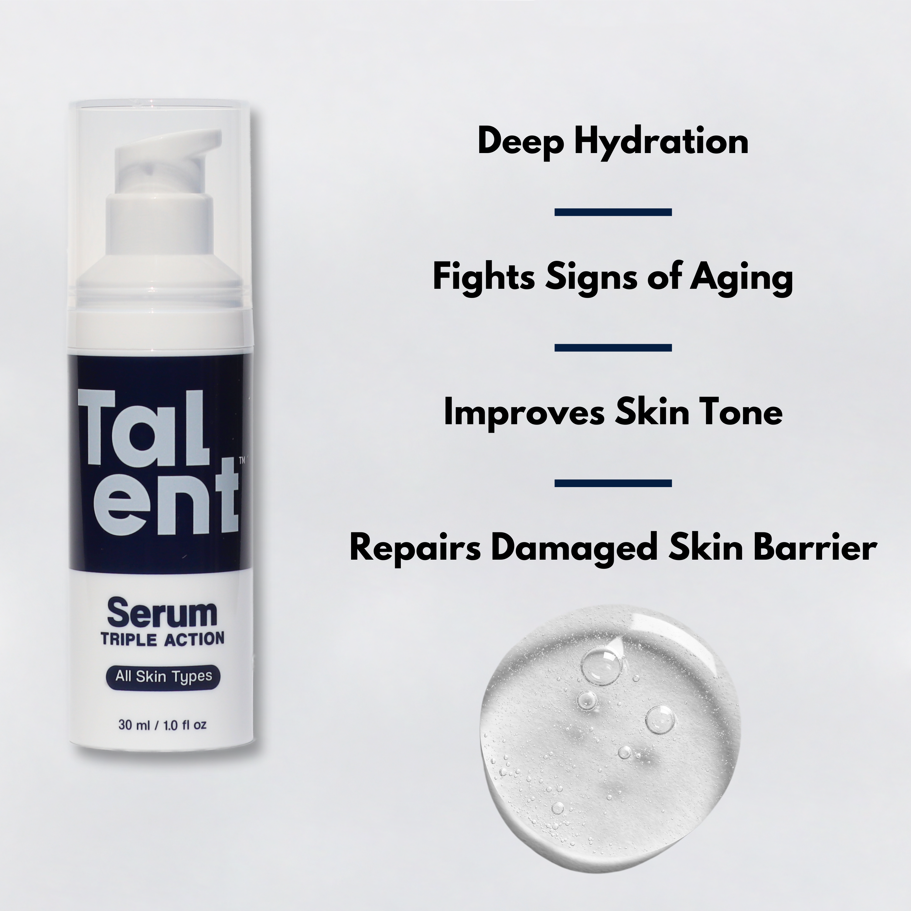 Triple Action Serum – Hydrates and restores skin barrier strength, reducing redness and uneven skin tone.