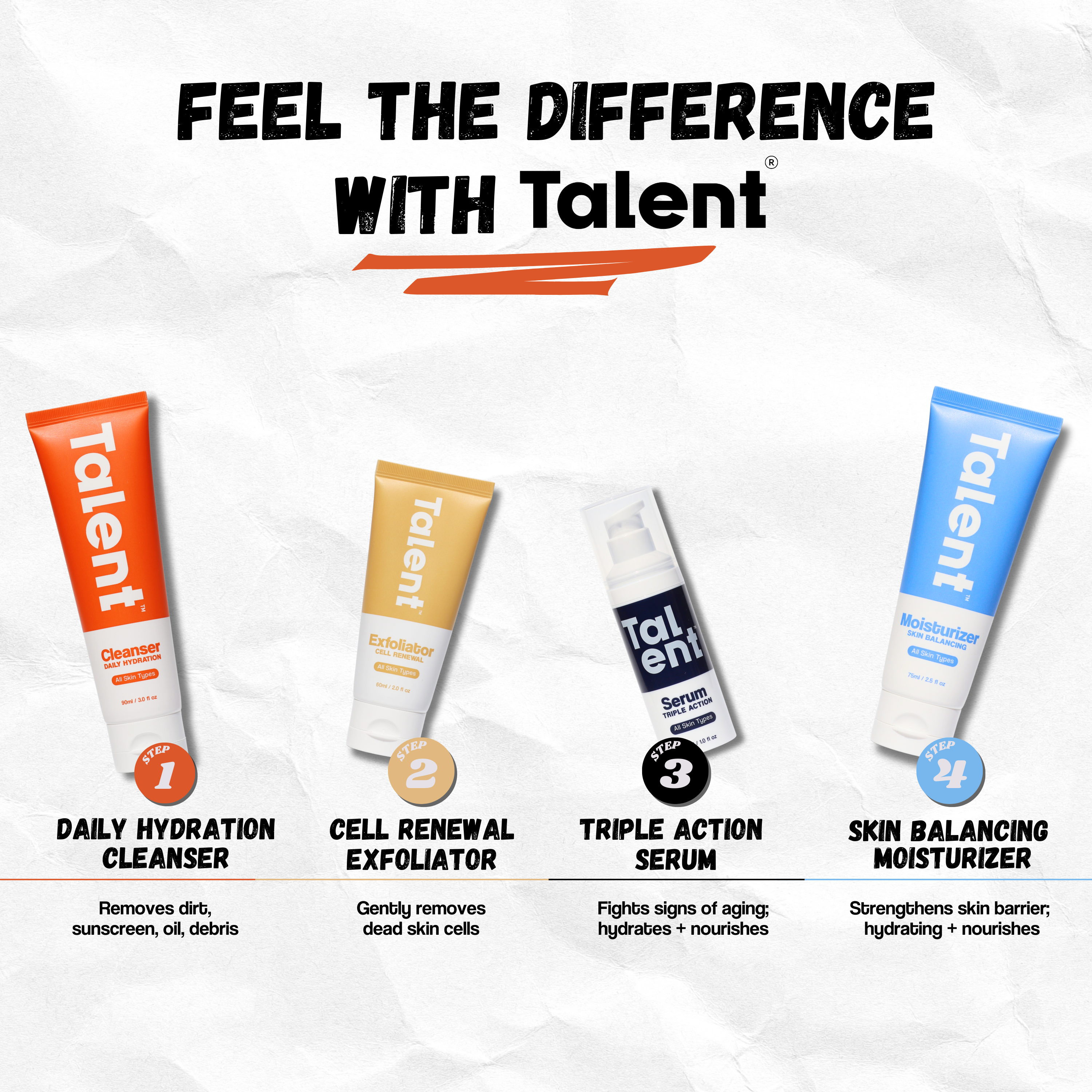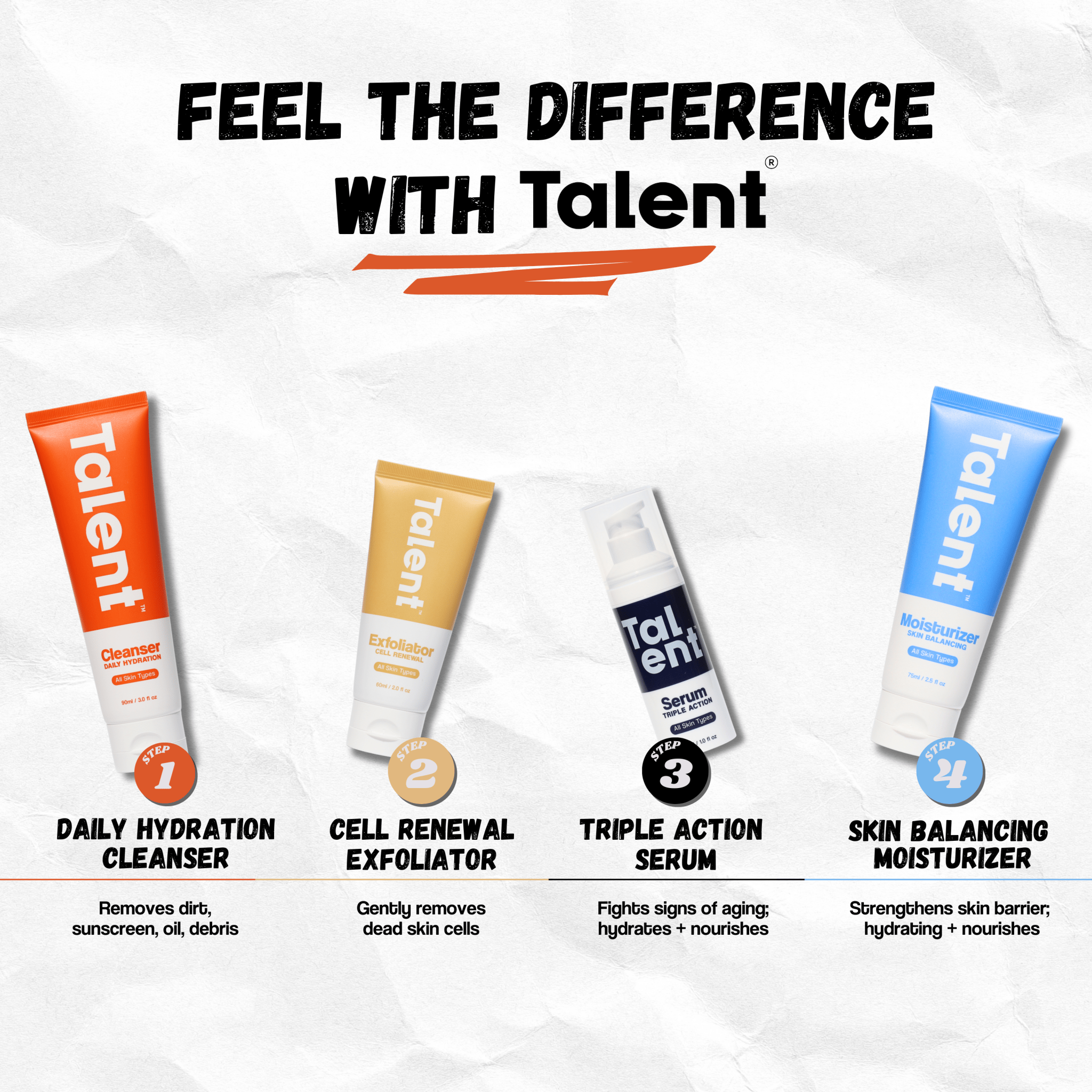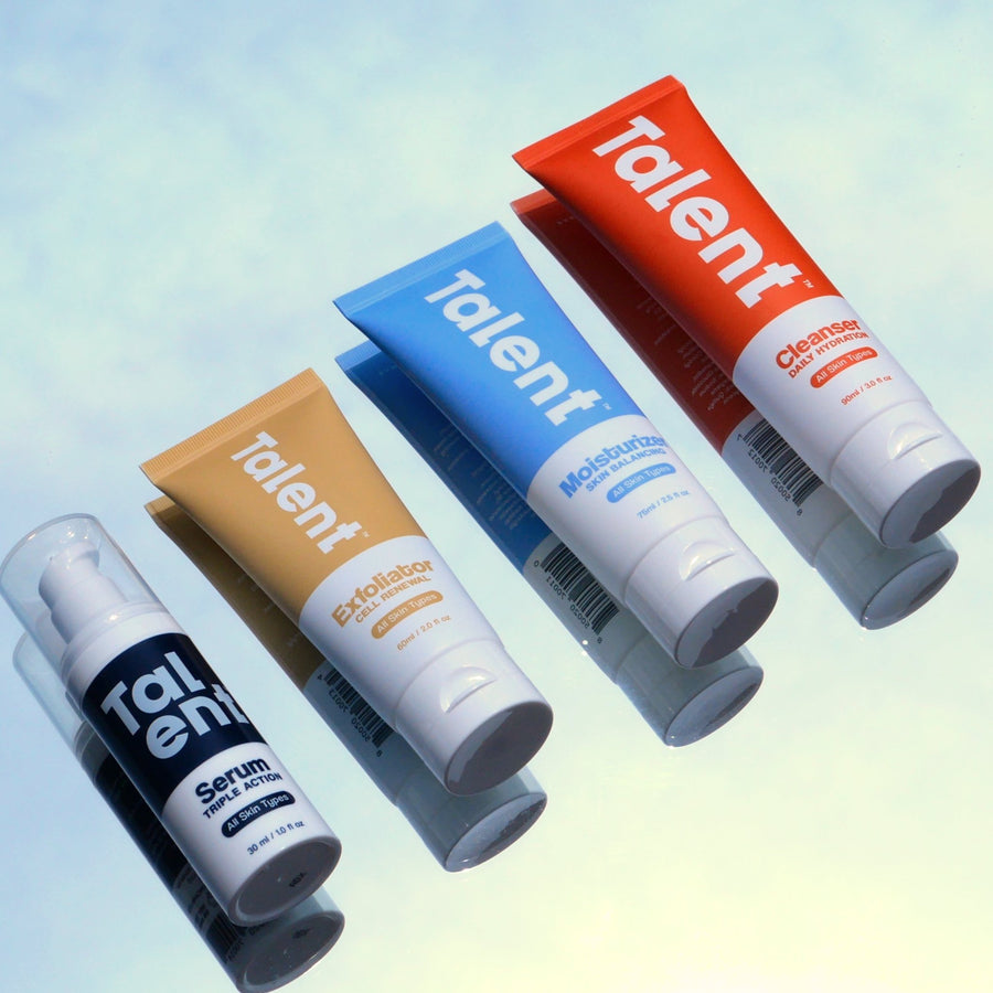 The Talent Kit is a simple, 4-step routine designed for active men who want clear, healthy skin without the hassle. Whether you’re hitting the gym, traveling, or grinding through long days, this kit keeps your skin fresh, hydrated, and balanced in under two minutes a day.