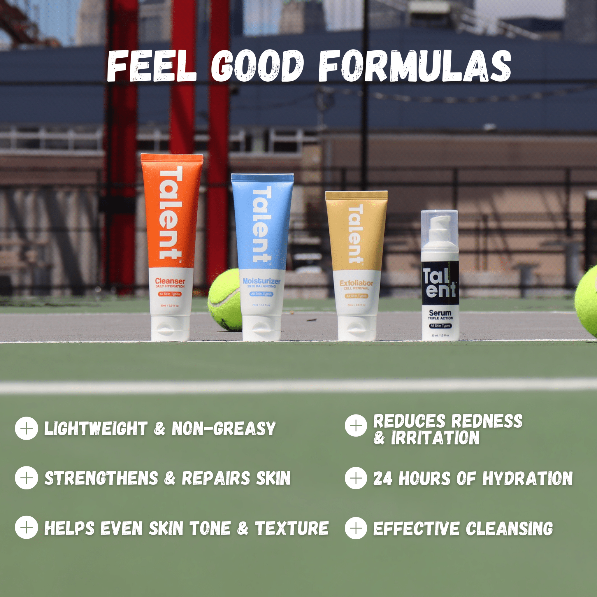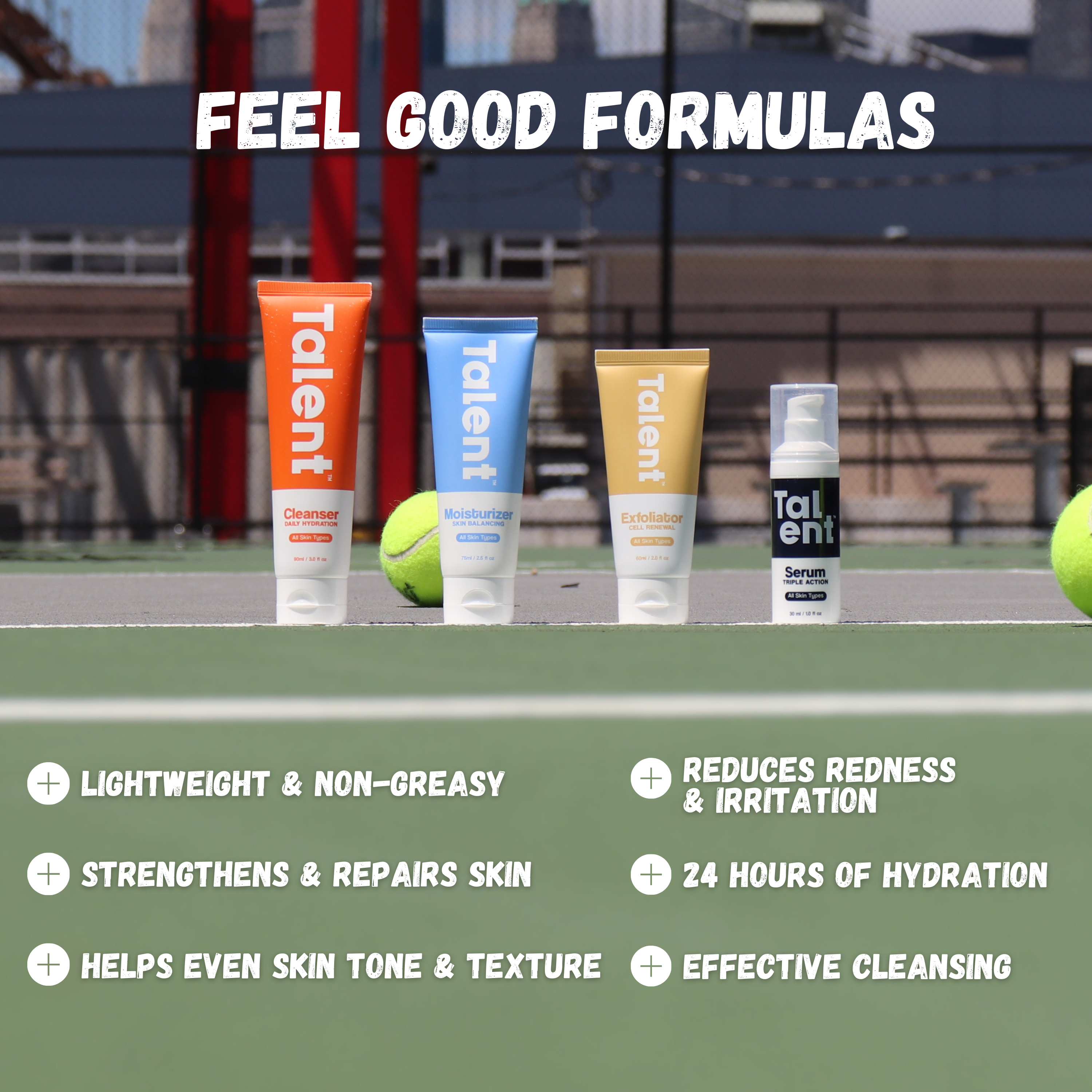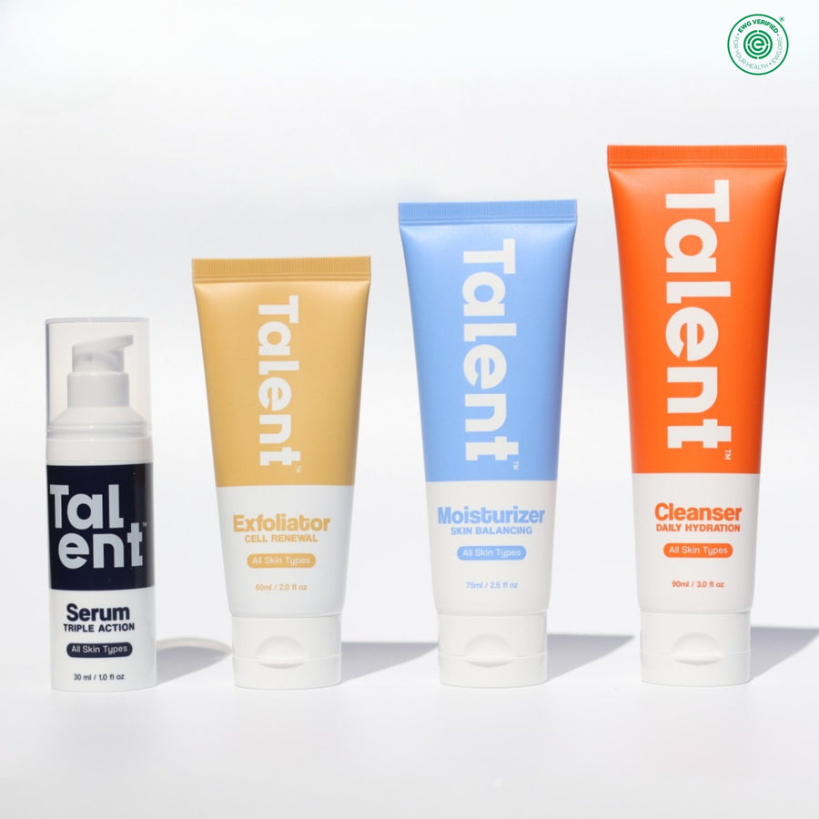 The Talent Kit is a simple, 4-step routine designed for active men who want clear, healthy skin without the hassle. Whether you’re hitting the gym, traveling, or grinding through long days, this kit keeps your skin fresh, hydrated, and balanced in under two minutes a day.
