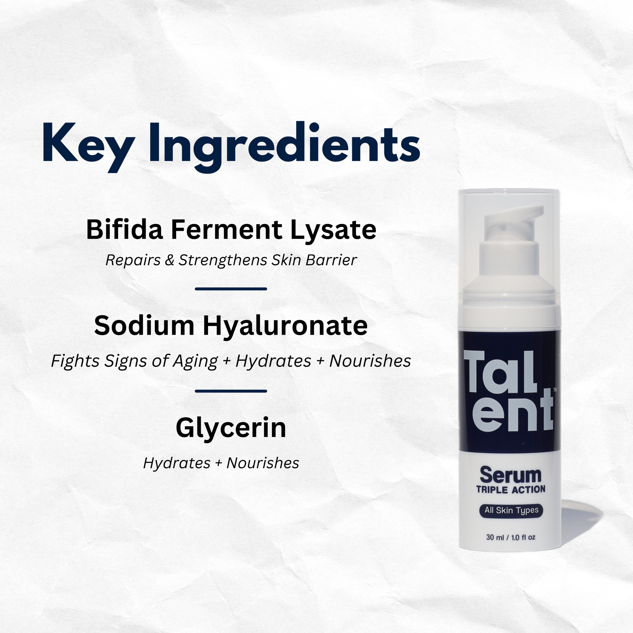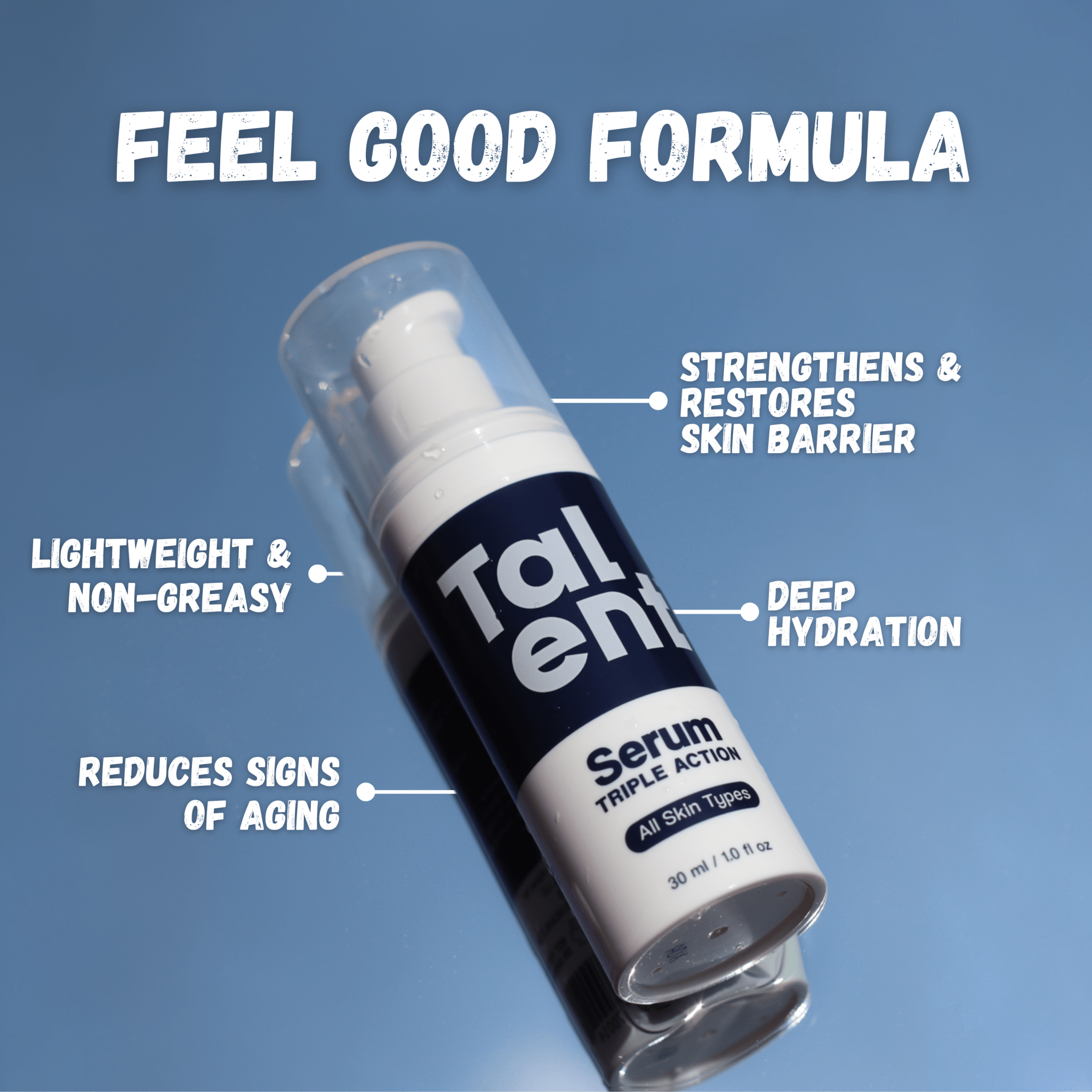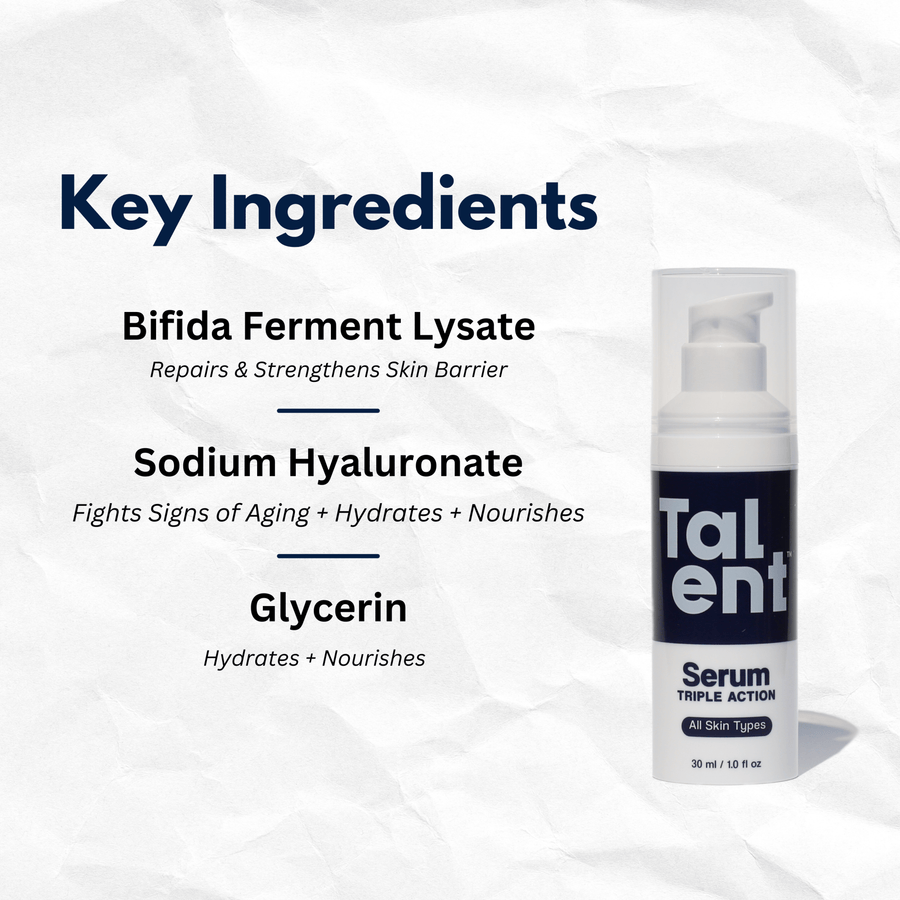The Triple Action Serum is a high-performance, probiotic-powered formula that delivers deep hydration, helps repair the skin barrier, and supports your skin’s natural recovery process. This lightweight, fragrance-free serum works to fight visible signs of aging, reduce redness, and improve texture—without greasiness or irritation. It’s everything your skin needs to bounce back from sweat, sun, and stress.